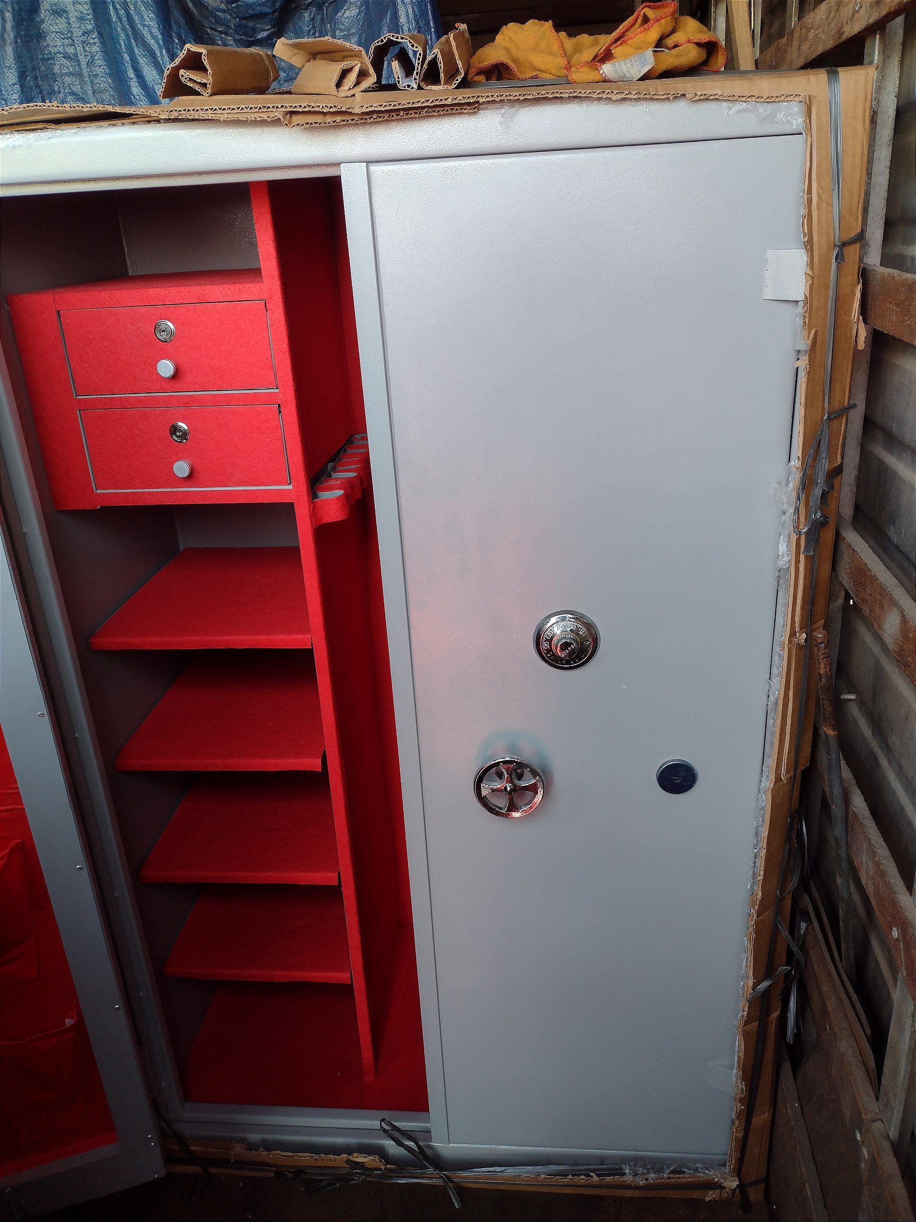 Cofre armário, para Armas - CA 140/90/50 • Especificações: - 02 gavetas; - 05 prateleiras 05 vãos; Suporte para armas longas, nas laterais e no fundo; - Forração completa; - Suporte para armas pequenas na porta (Bolsa) - 12 pinos de travamento na horizontal e vertical nas 2 portas, segredo de 3 combinações numérica - Fechadura tetra