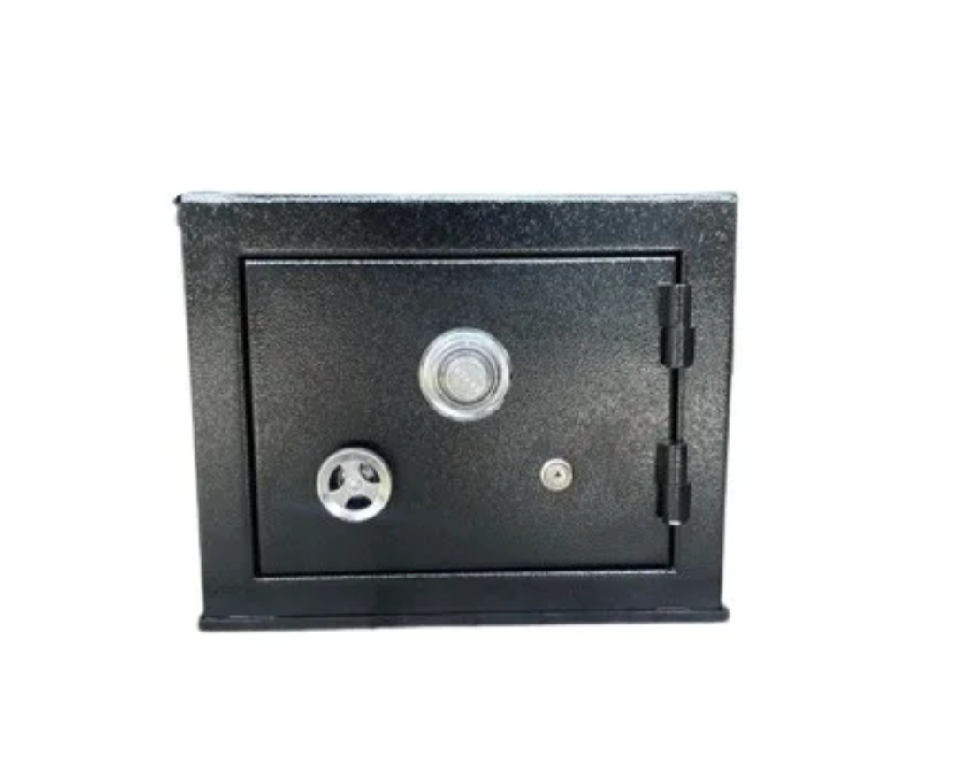 Cofre vazio em chapa em aço com segredo mecânico de 3 combinações, 2 ferrolhos de travamento prateleira removível e manual de instruções.