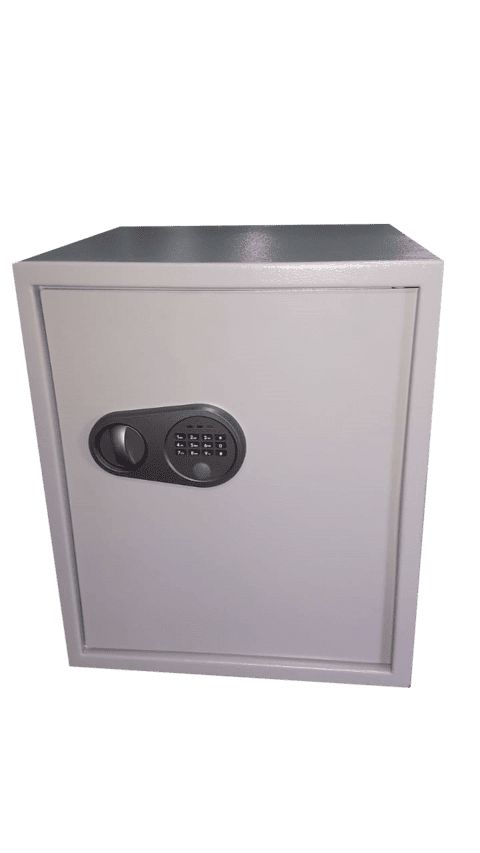 Cofre digital eletrônico com teclado digital com senha de 03 a 08 dígitos e chave de emergência abertura em caso a descarregar a bateria, u.ma prateleira removível.